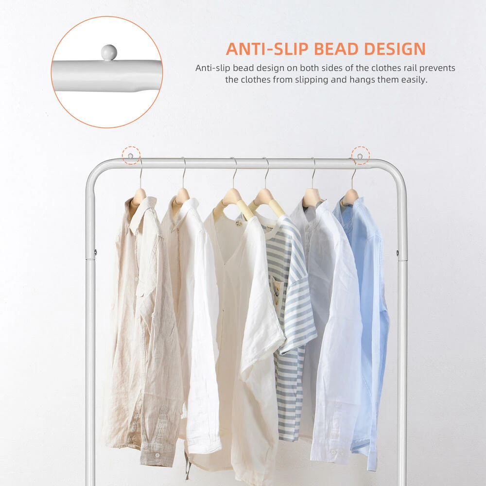 At both end of the hanging rail is designed with beads to prevent the clothes falling down from the rack. The garment rack has humanity design based on minimalism, makes the important contributions to maximize your limited space.