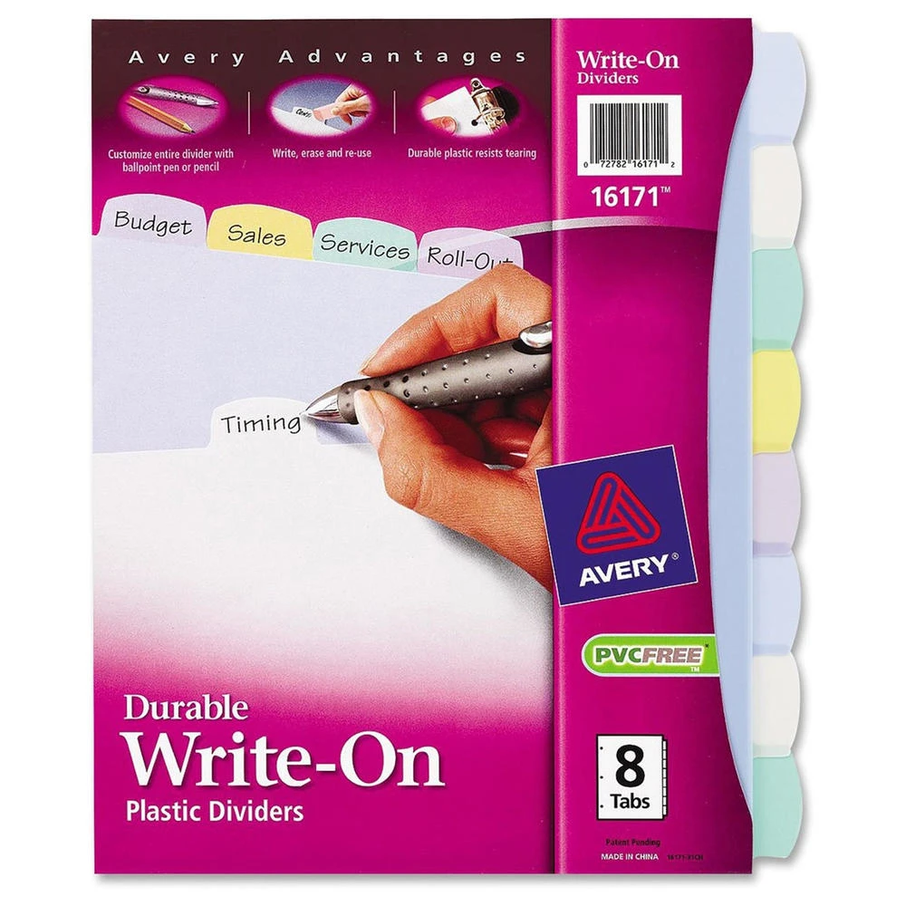 - Durable plastic dividers let you write, erase and reuse