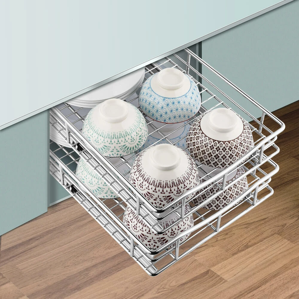 The pull-out cabinet drawer is made of chrome-plated iron, anti-rust and durable to use, high load capacity up to 44 lbs, perfect drawer for storing cook and bake wear, food, cleaning supplies, and so on.