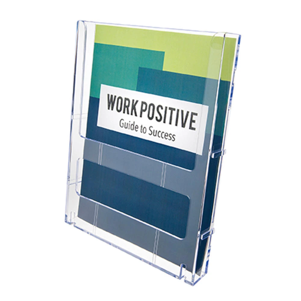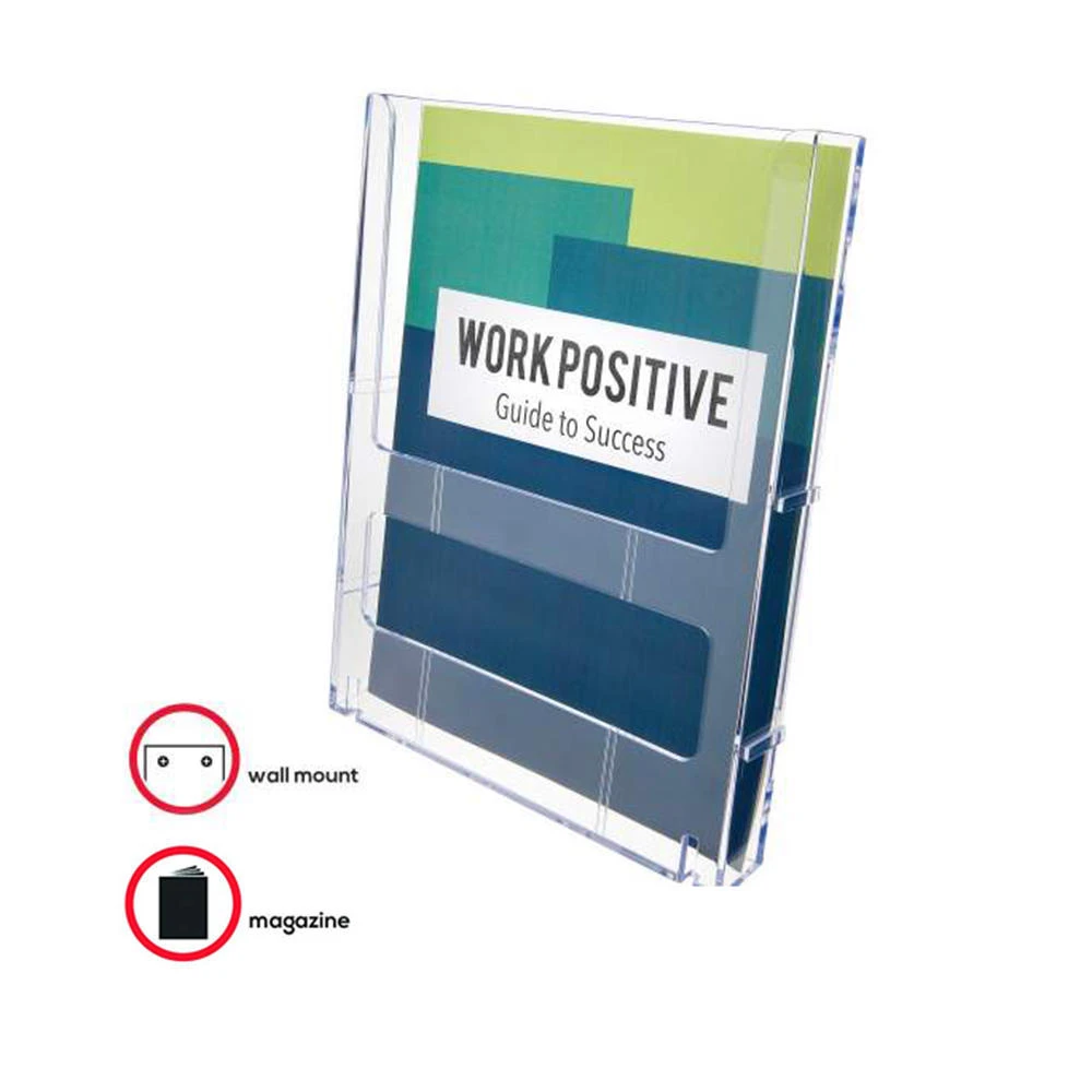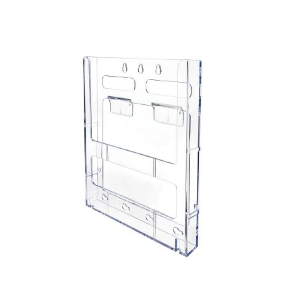 “Create your own display with the Lit Loc Interlocking Display System. Versatile literature holders link together for a cost-effective, space-saving, versatile solution to customize wall displays. Dovetail design allows individual units to attach side-by-side and lock into place. Linking tabs allow front-to-back mounting. Optional base/wall support delivers added stability, especially when mounting vertically for multi-tiered usage, and is sold separately. This individual magazine-size holder offers a capacity of up to 1″ of printed material. Durable, clear plastic construction is 100 percent recyclable.”