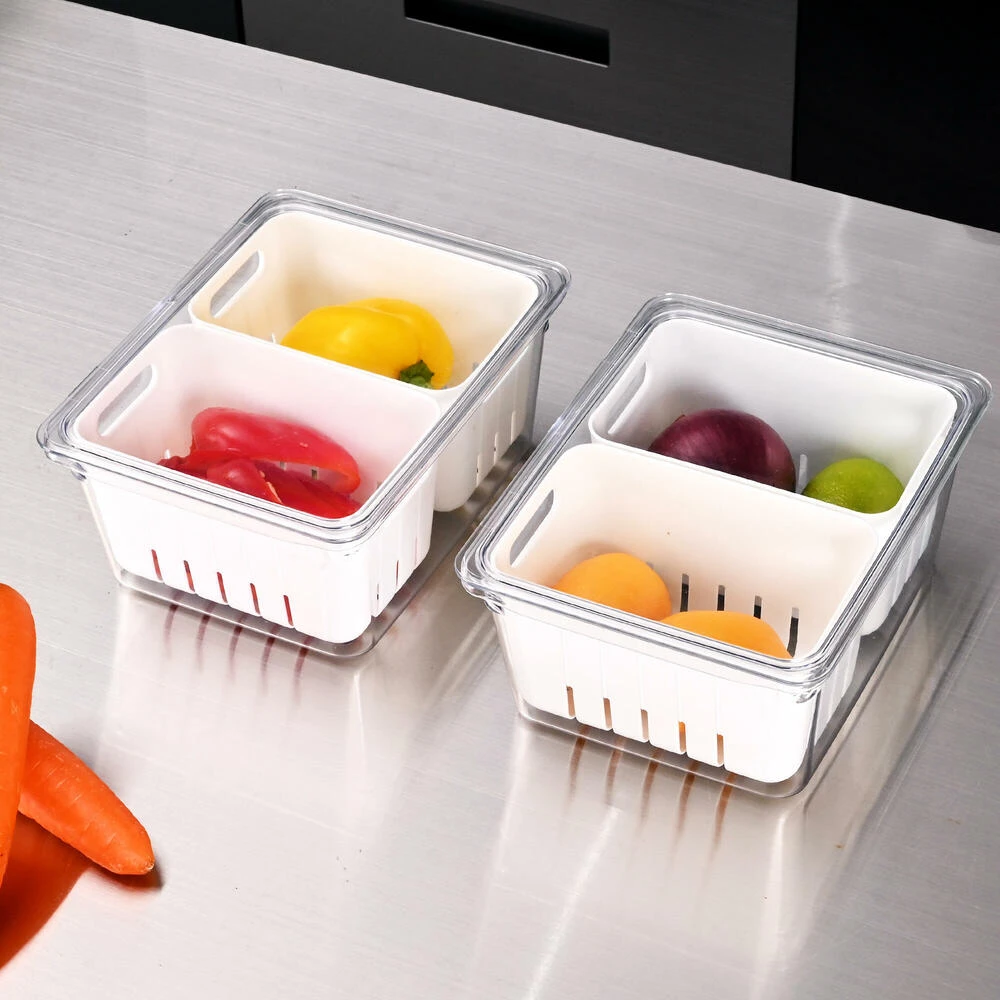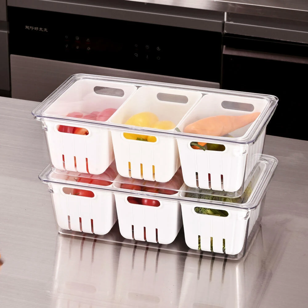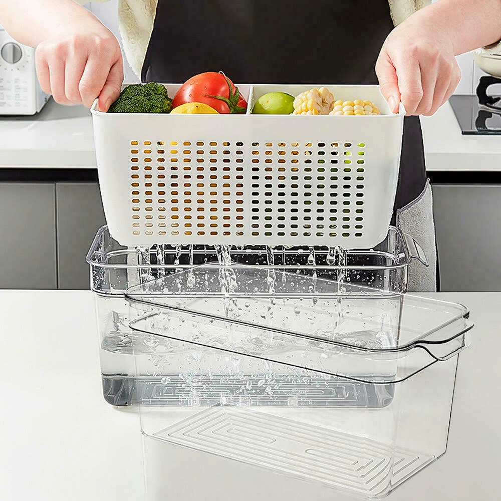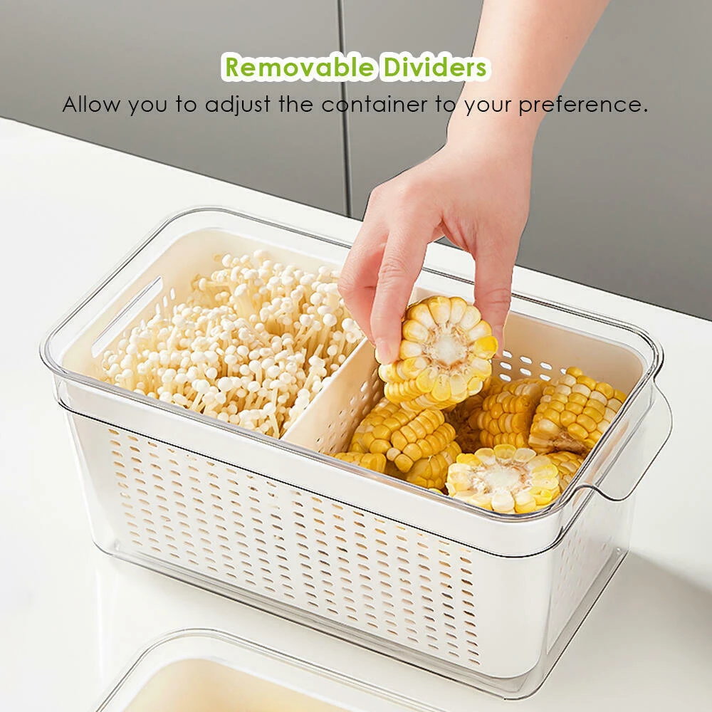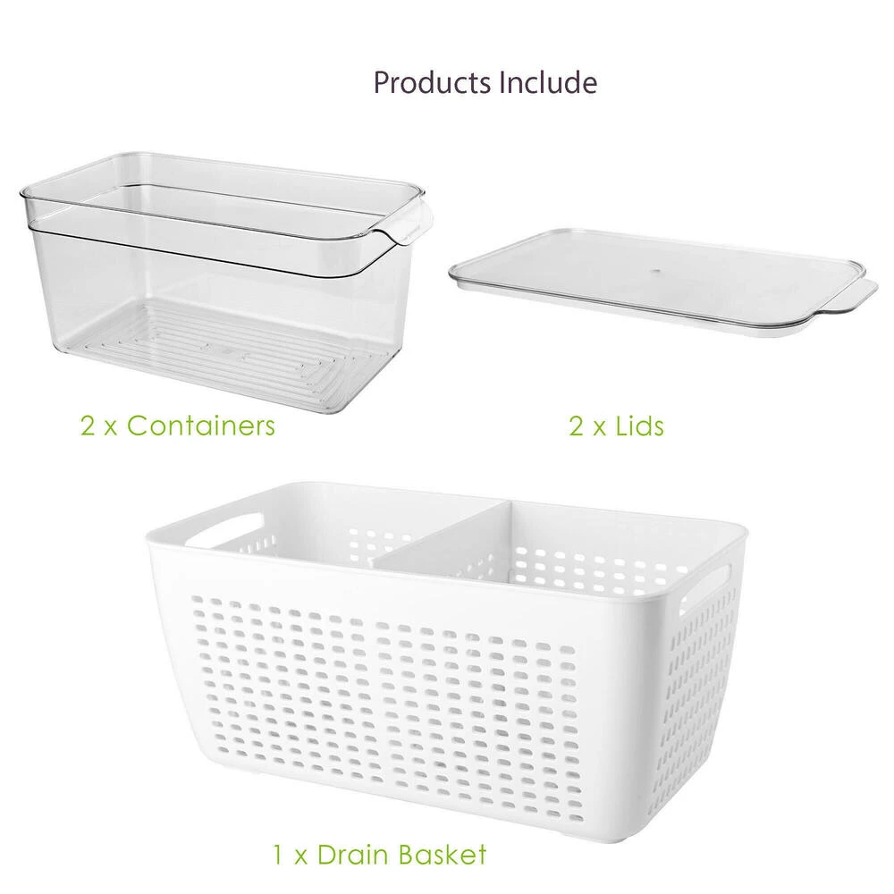 The refrigerator bin comes with a double bin, the outer is a big clear box with a lid, and the inner is white baskets with holding holes. The double fruit baskets keep the fruit fresh with the drainage hole. There are at least four baskets included to keep vegetables and fruits separate from each other without dripping. The small baskets are specially designed for fruit storage in a refrigerator, also you can use the bin without the inside baskets for a larger storage space.
