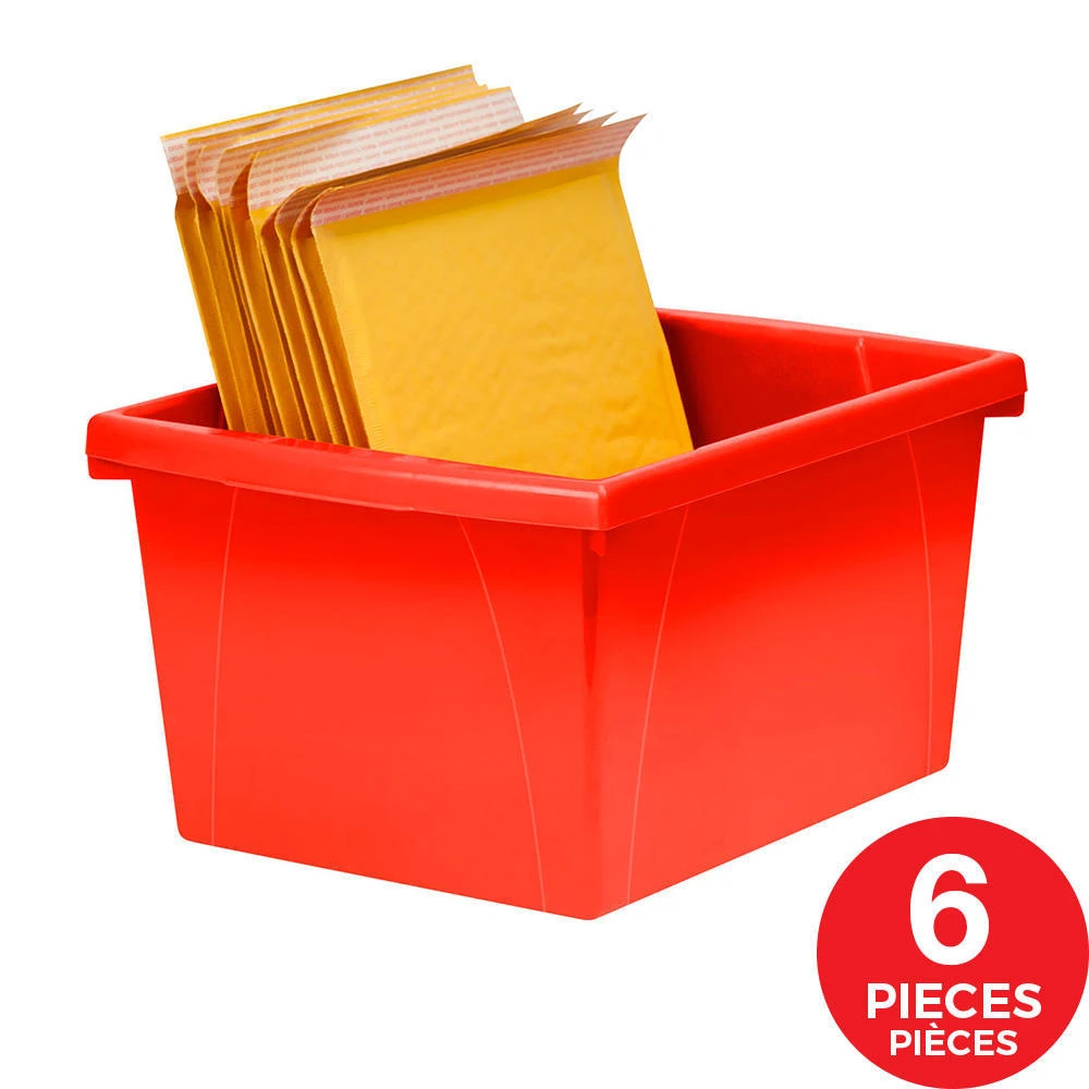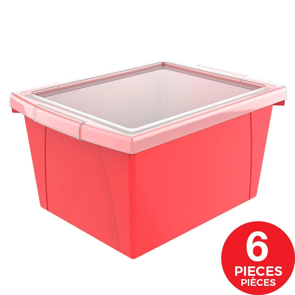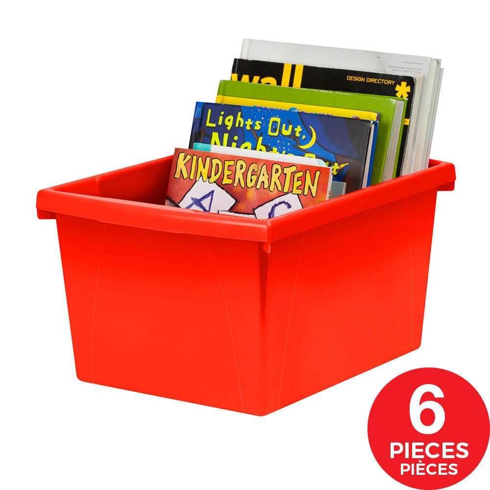 These storage bins are the ultimate companion for your bookshelf or cubby. The easy to grip handles are perfectly sized for big and small hands. They are made of impact resistant plastic and come in wonderfully bright colors. Use them to organize your room and store all your supplies. Clear snap on lid is included