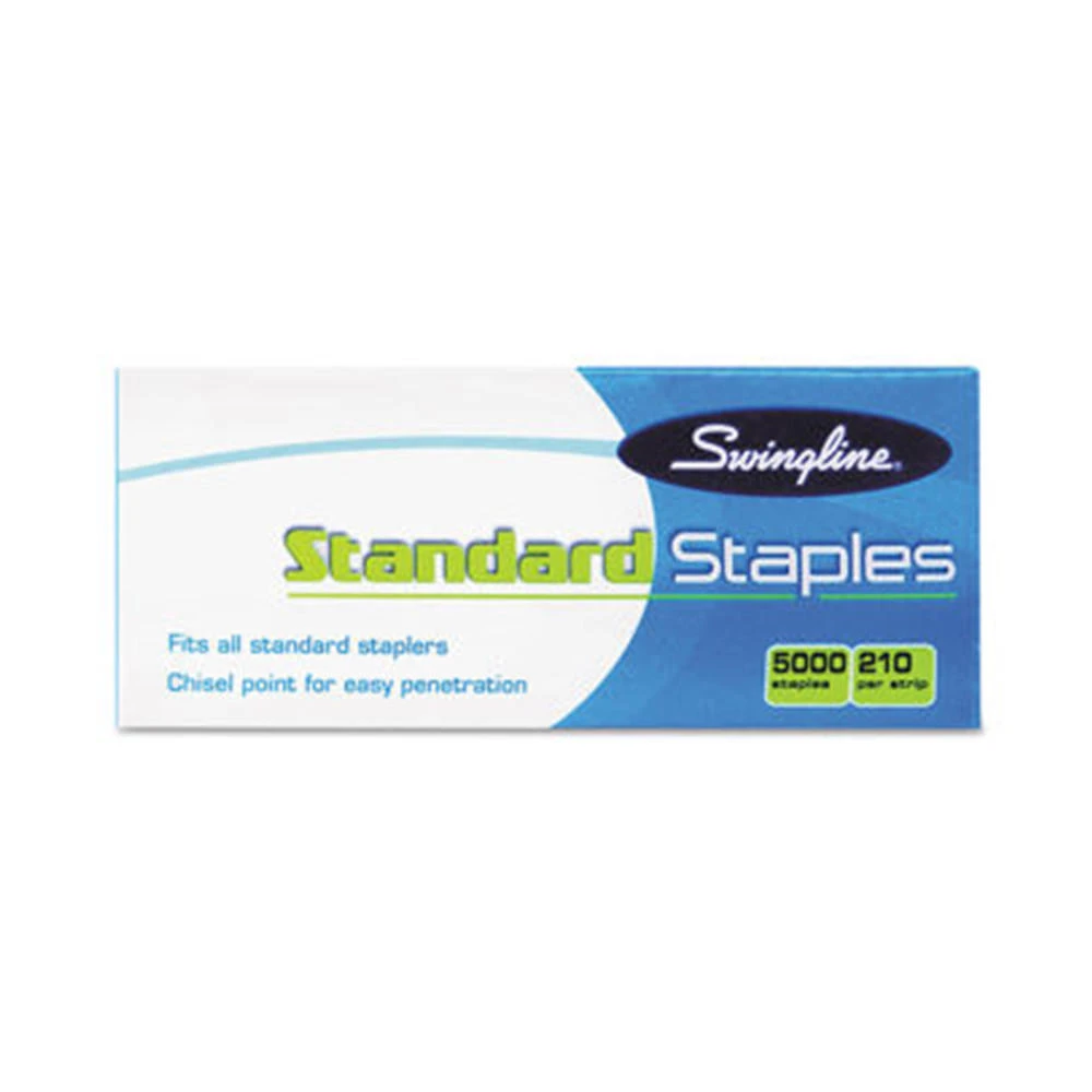 Eliminate the hassle of a jammed stapler when you use these Swingline standard staples that are specially engineered with sharp chisel points to ensure a consistent job. Designed to perform with 15 percent fewer misforms than standard staples, these Swingline staples help speed up your office work. These staples come in strips of 210 with a 1/4-inch in leg length, ensuring their compatibility with any standard-size stapler. These high-volume packs contain five boxes with 5,000 staples each, making restocking your supply closet fast and convenient.